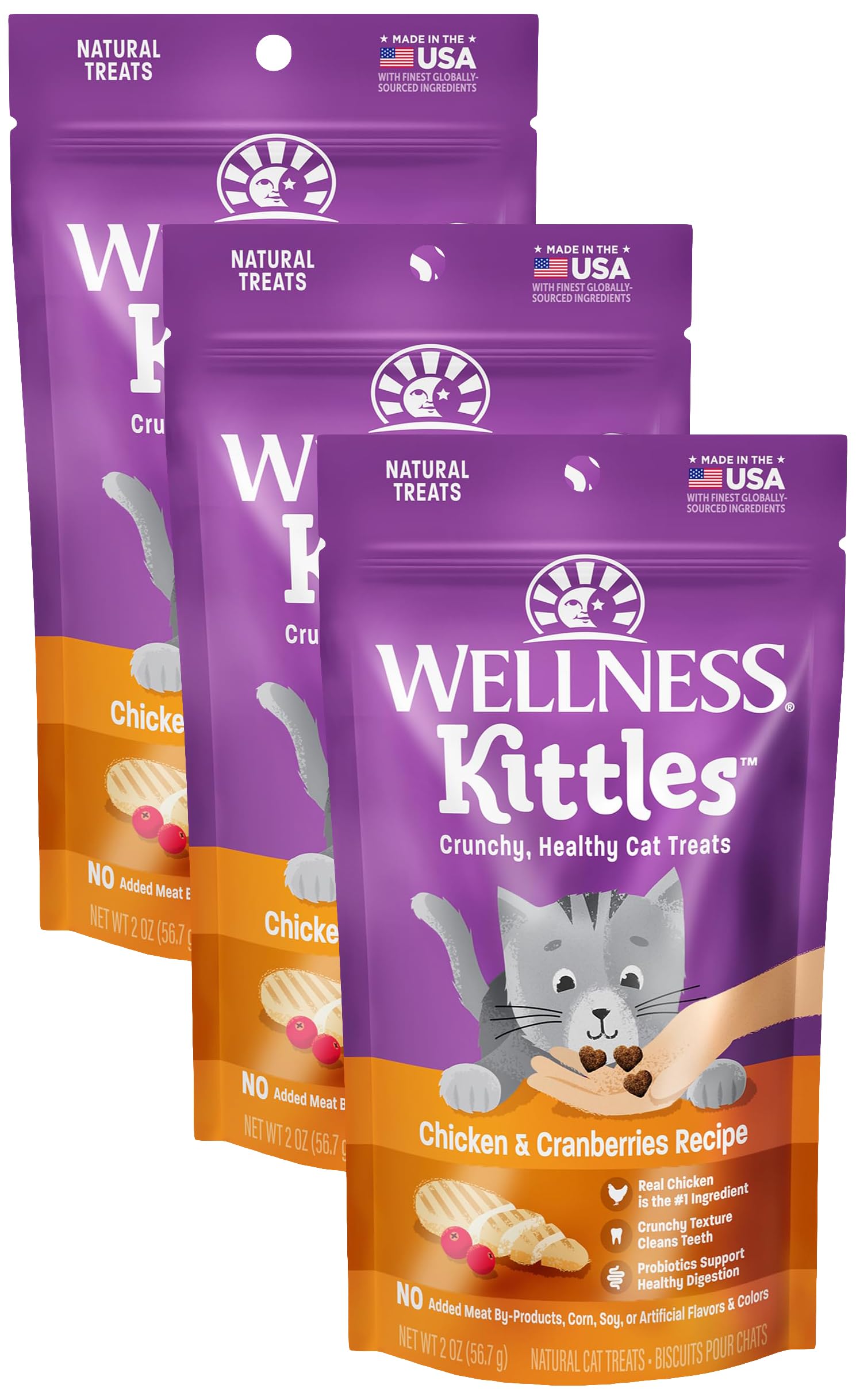 Wellness Kittles Crunchy Natural Grain Free Cat Treats, Chicken & Cranberries Recipe, All Life Stages, 2-Ounce Bag (Pack of 3)