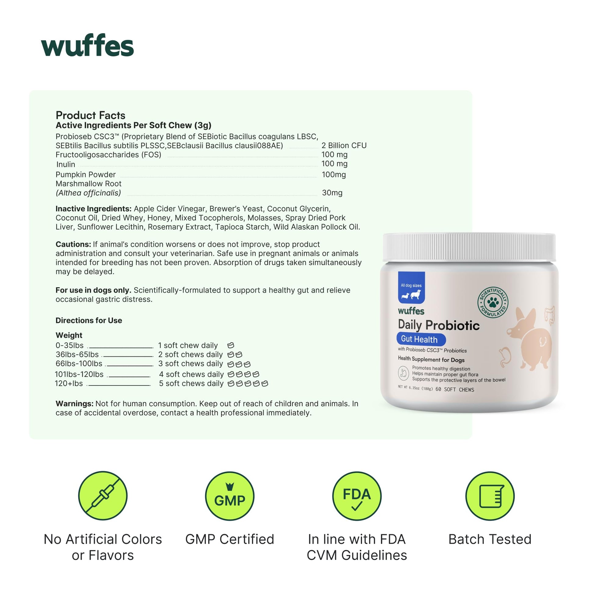 - Comprehensive Digestive Support: Wuffes Daily Probiotic chews are formulated to enhance your dog's digestive health by helping maintain a healthy balance of gut bacteria, improve nutrient absorption, and support the immune system. Our formula includes prebiotics and soothing ingredients like marshmallow root and pumpkin powder, offering digestive support for dogs of all ages.
